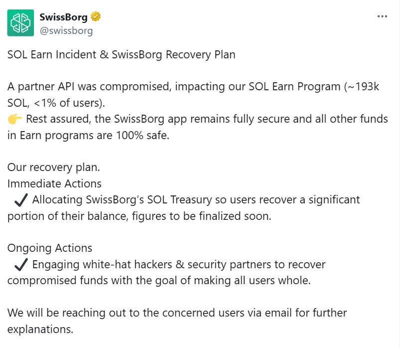 SwissBorg๋ ํ์ฌ API ์์ ํ 4,100๋ง ๋ฌ๋ฌ์ SOL์ ํดํนํ์ต๋๋ค.