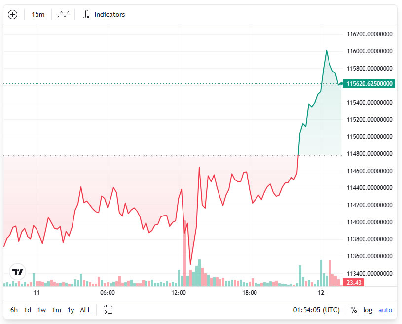 ๋นํธ์ฝ์ธ์ ๊ธ์์ผ ์ค์ ๊ฑฐ๋์์ ์ผ์ผ 1.5% ์์นํ ํ 3์ฃผ ๋ง์ ์ฒ์์ผ๋ก 116,000๋ฌ๋ฌ๋ฅผ ๋ํํ์ต๋๋ค.