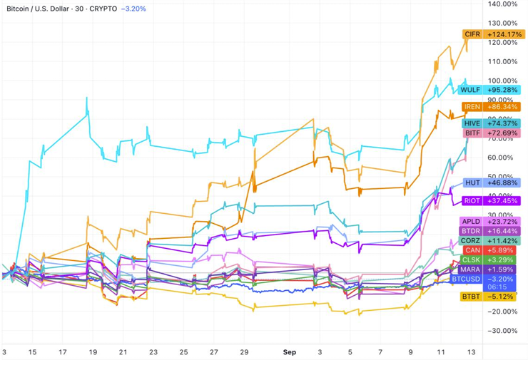 The Miner Mag์ ์ต์ ์ ๊ณ ์ ๋ฐ์ดํธ์ ๋ฐ๋ฅด๋ฉด Cipher Mining(CIFR), Terawulf(WULF), Iris Energy(IREN), Hive Digital Technologies(HIVE) ๋ฐ Bitfarms(BITF)์ ์ฃผ๊ฐ๋ ์ง๋ ํ ๋ฌ ๋์ 73%์์ 124% ์ฌ์ด ๊ธ๋ฑํ์ต๋๋ค. ๋ฐ๋ฉด ๋นํธ์ฝ์ธ(BTC)์ ๊ฐ์ ๊ธฐ๊ฐ 3% ์ด์ ํ๋ฝํ์ต๋๋ค.