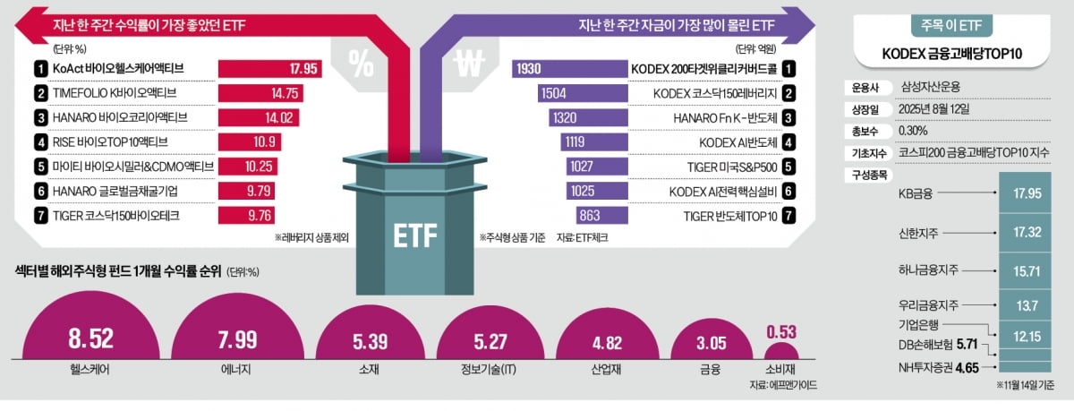16์ผ ETF์ฒดํฌ์— ๋”ฐ๋ฅด๋ฉด ์ง€๋‚œ์ฃผ ๊ตญ๋‚ด ์ƒ์žฅ ETF ์ˆ˜์ต๋ฅ  1~5์œ„(๋ ˆ๋ฒ„๋ฆฌ์ง€ ์ƒํ’ˆ ์ œ์™ธ)๋Š” ๋ชจ๋‘ ๋ฐ”์ด์˜ค ๊ด€๋ จ ์•กํ‹ฐ๋ธŒ ETF๊ฐ€ ์ฐจ์ง€ํ–ˆ๋‹ค. ‘KoAct ๋ฐ”์ด์˜คํ—ฌ์Šค์ผ€์–ด์•กํ‹ฐ๋ธŒ’๊ฐ€ 17.95%๋กœ ๊ฐ€์žฅ ๋†’์•˜๊ณ , ‘TIMEFOLIO K๋ฐ”์ด์˜ค์•กํ‹ฐ๋ธŒ’๋Š” 14.75% ๋›ฐ์—ˆ๋‹ค. ๊ทธ ๋’ค๋ฅผ ‘HANARO ๋ฐ”์ด์˜ค์ฝ”๋ฆฌ์•„์•กํ‹ฐ๋ธŒ'(14.02%), ‘RISE ๋ฐ”์ด์˜คTOP10์•กํ‹ฐ๋ธŒ'(10.9%), ‘๋งˆ์ดํ‹ฐ ๋ฐ”์ด์˜ค์‹œ๋ฐ€๋Ÿฌ&CDMO์•กํ‹ฐ๋ธŒ'(10.25) ๋“ฑ์ด ์ด์—ˆ๋‹ค.