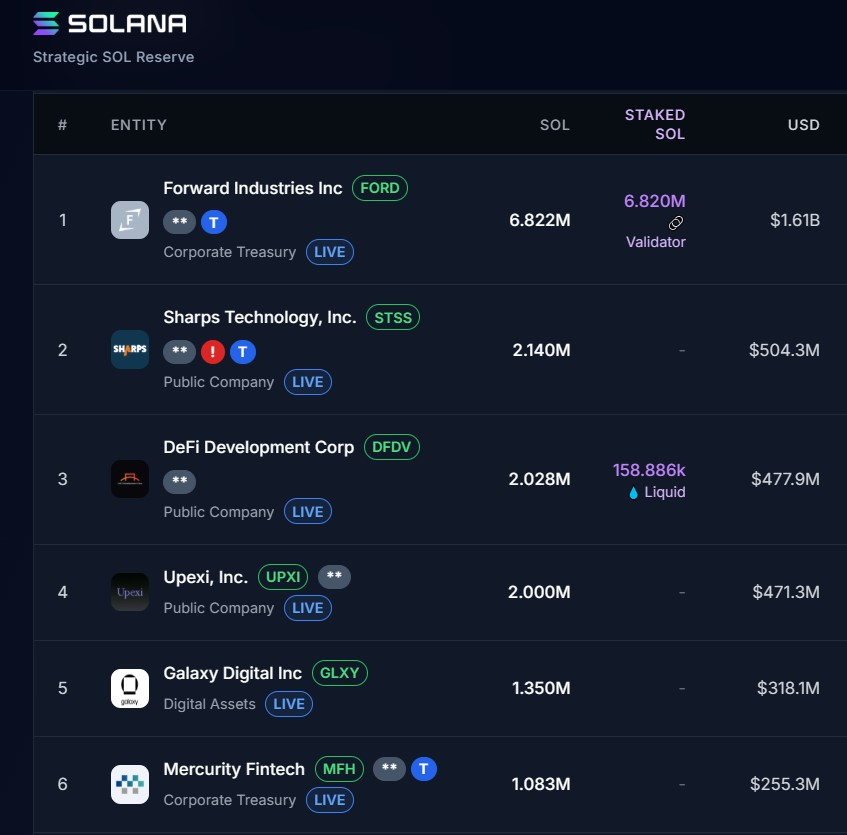๊ฐ€์žฅ ํฐ ์ฐธ๊ฐ€์ž๋Š” Forward Industries๋กœ 680๋งŒ ๊ฐœ ์ด์ƒ, 16์–ต 1์ฒœ๋งŒ ๋‹ฌ๋Ÿฌ ์ƒ๋‹น์˜ SOL์„ ๋ณด์œ ํ•˜๊ณ  ์žˆ์Šต๋‹ˆ๋‹ค. Sharps Technology, DeFi Development Corp. ๋ฐ Upexi์™€ ๊ฐ™์€ ๋‹ค๋ฅธ ํšŒ์‚ฌ๋Š” ๊ฐ๊ฐ ์•ฝ 200๋งŒ SOL์„ ๋ณด์œ ํ•˜๊ณ  ์žˆ์œผ๋ฉฐ ๊ฐœ๋ณ„ ํ• ๋‹น์€ 4์–ต ๋‹ฌ๋Ÿฌ๋ฅผ ์ดˆ๊ณผํ•ฉ๋‹ˆ๋‹ค.
