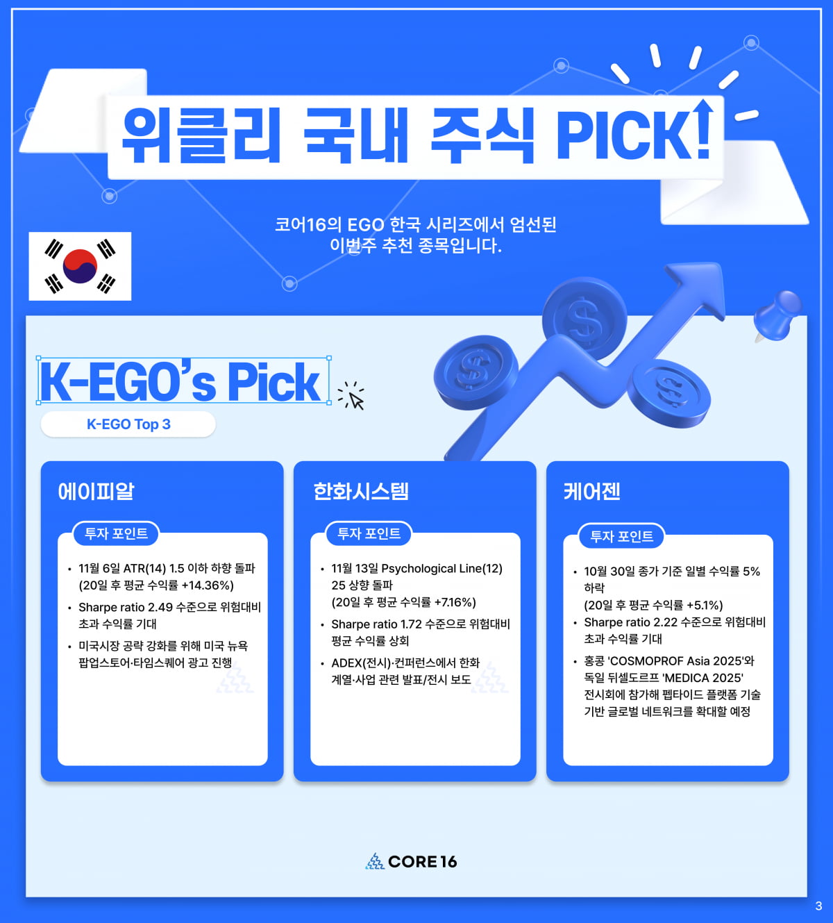 19์ผ ์ฝ”์–ด16์˜ ํ€€ํŠธ ์•Œ๊ณ ๋ฆฌ์ฆ˜ ‘K-EGO’๋Š” ์ด๋ฒˆ ์ฃผ ๊ตญ๋‚ด ์ฃผ์‹์‹œ์žฅ์—์„œ ์—์ดํ”ผ์•Œ, ํ•œํ™”์‹œ์Šคํ…œ, ์ผ€์–ด์  ์„ ์œ ๋ง ํˆฌ์ž์ฒ˜๋กœ ์„ ์ •ํ–ˆ๋‹ค.