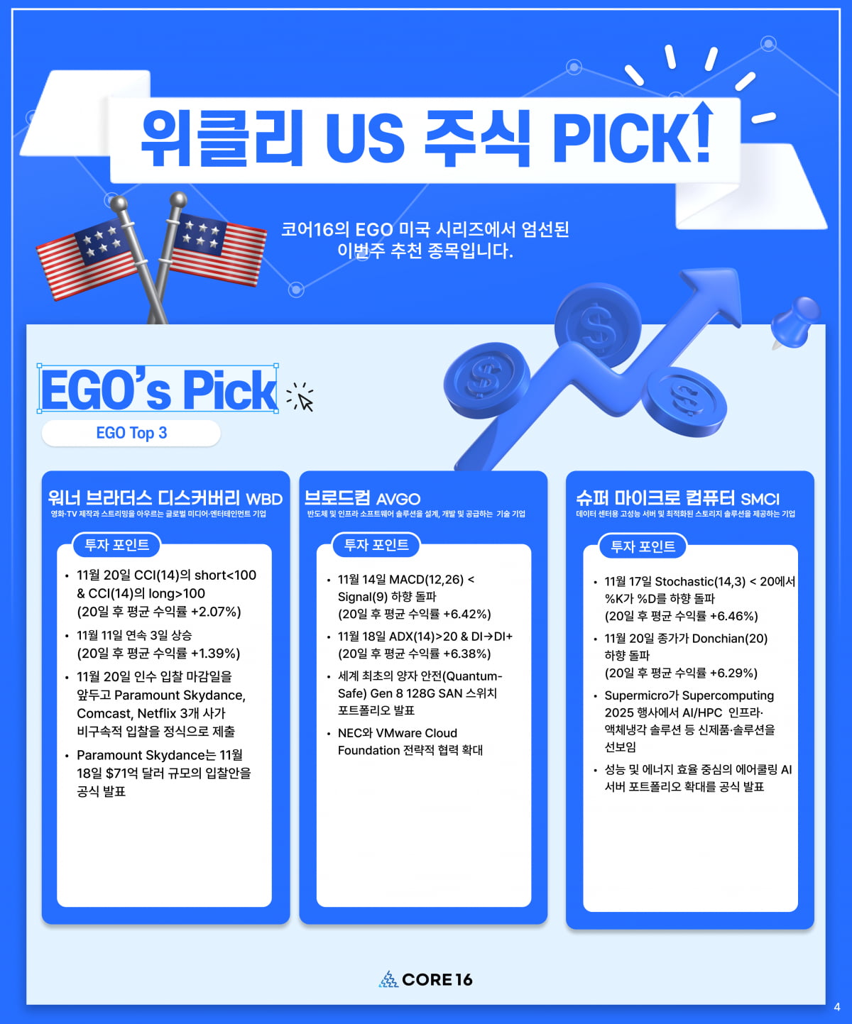 27์ผ ์ฝ”์–ด16์˜ ํ€€ํŠธ ์•Œ๊ณ ๋ฆฌ์ฆ˜ EGO3์€ ์ด๋ฒˆ ์ฃผ ๋ฏธ๊ตญ ์ฃผ์‹์‹œ์žฅ์—์„œ ์›Œ๋„ˆ๋ธŒ๋ผ๋”์Šค ๋””์Šค์ปค๋ฒ„๋ฆฌ, ๋ธŒ๋กœ๋“œ์ปด, ์Šˆํผ ๋งˆ์ดํฌ๋กœ ์ปดํ“จํ„ฐ๋ฅผ ์œ ๋ง ํˆฌ์ž์ฒ˜๋กœ ์„ ์ •ํ–ˆ๋‹ค.