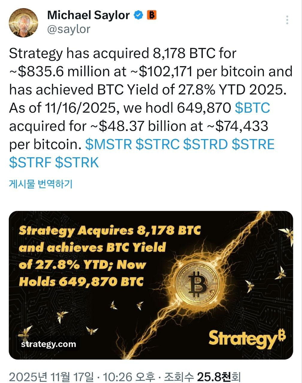 ์ด๋‚  ๋งˆ์ดํด ์„ธ์ผ๋Ÿฌ MSTR ์˜์žฅ์˜ X(๊ตฌ ํŠธ์œ„ํ„ฐ)์— ๋”ฐ๋ฅด๋ฉด MSTR์€ 8178๊ฐœ์˜ ๋น„ํŠธ์ฝ”์ธ์„ 8์–ต3560๋งŒ๋‹ฌ๋Ÿฌ(์•ฝ 1์กฐ2221์–ต์›)์— ๋งค์ž…ํ–ˆ๋‹ค.