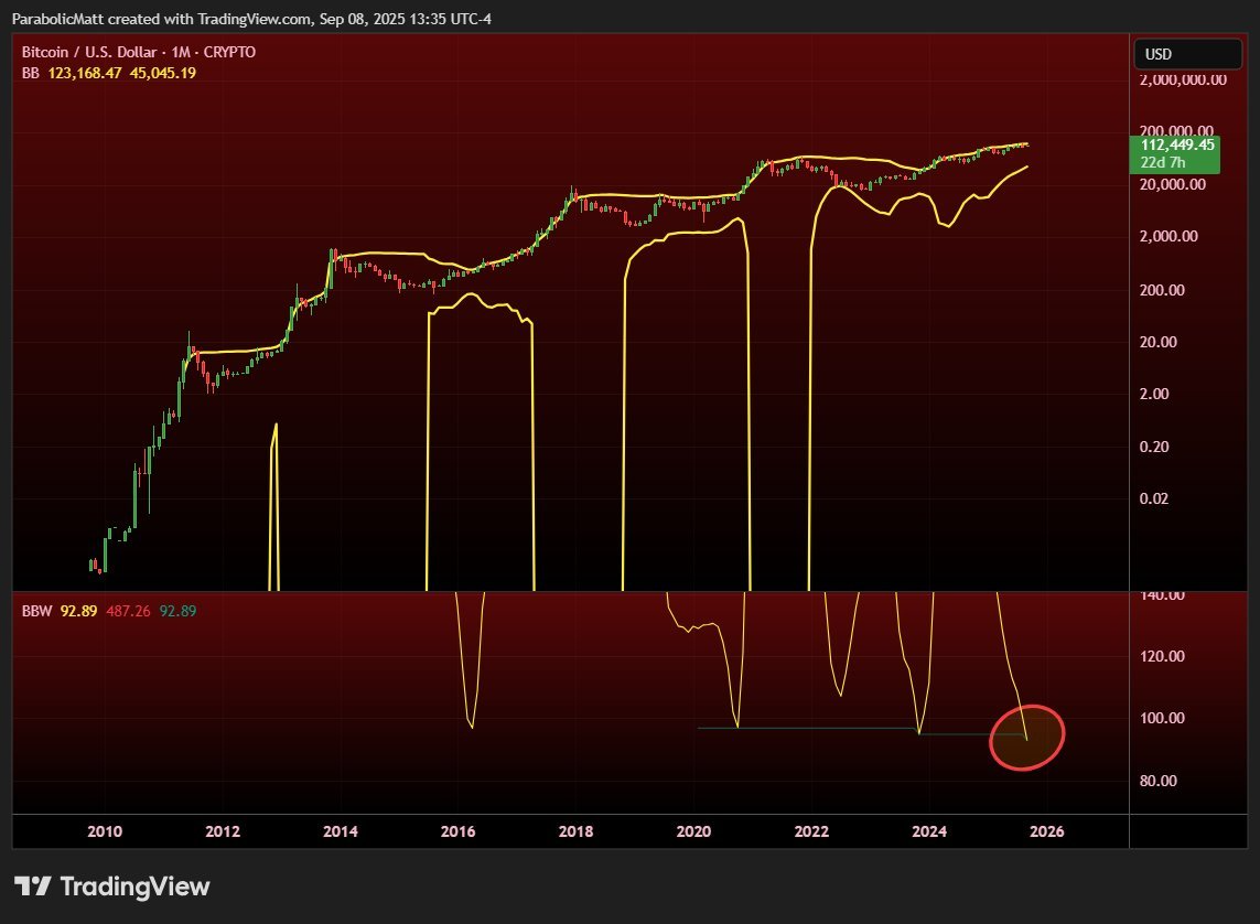 ์•”ํ˜ธํ™”ํ ํŠธ๋ ˆ์ด๋”์ด์ž ์• ๋„๋ฆฌ์ŠคํŠธ์ธ ๋งคํŠœ ํ•˜์ผ๋žœ๋“œ(Matthew Hyland)๋Š” ํŠน์ • ๋ฒ”์œ„ ๋‚ด์—์„œ ์ž์‚ฐ์˜ ๋ชจ๋ฉ˜ํ…€๊ณผ ๋ณ€๋™์„ฑ์„ ์ธก์ •ํ•˜๋Š” ๋„๊ตฌ์ธ ๋น„ํŠธ์ฝ”์ธ(BTC)์˜ ๋ณผ๋ฆฐ์ € ๋ฐด๋“œ๊ฐ€ 2009๋…„ 1์›” ์ถœ์‹œ ์ดํ›„ ์›”๊ฐ„ ๊ธฐ๊ฐ„์—์„œ “๊ฐ€์žฅ ๊ทน๋‹จ์ ์ธ ์ˆ˜์ค€”์— ๋„๋‹ฌํ–ˆ๋‹ค๊ณ  ์–ธ๊ธ‰ํ–ˆ์Šต๋‹ˆ๋‹ค.