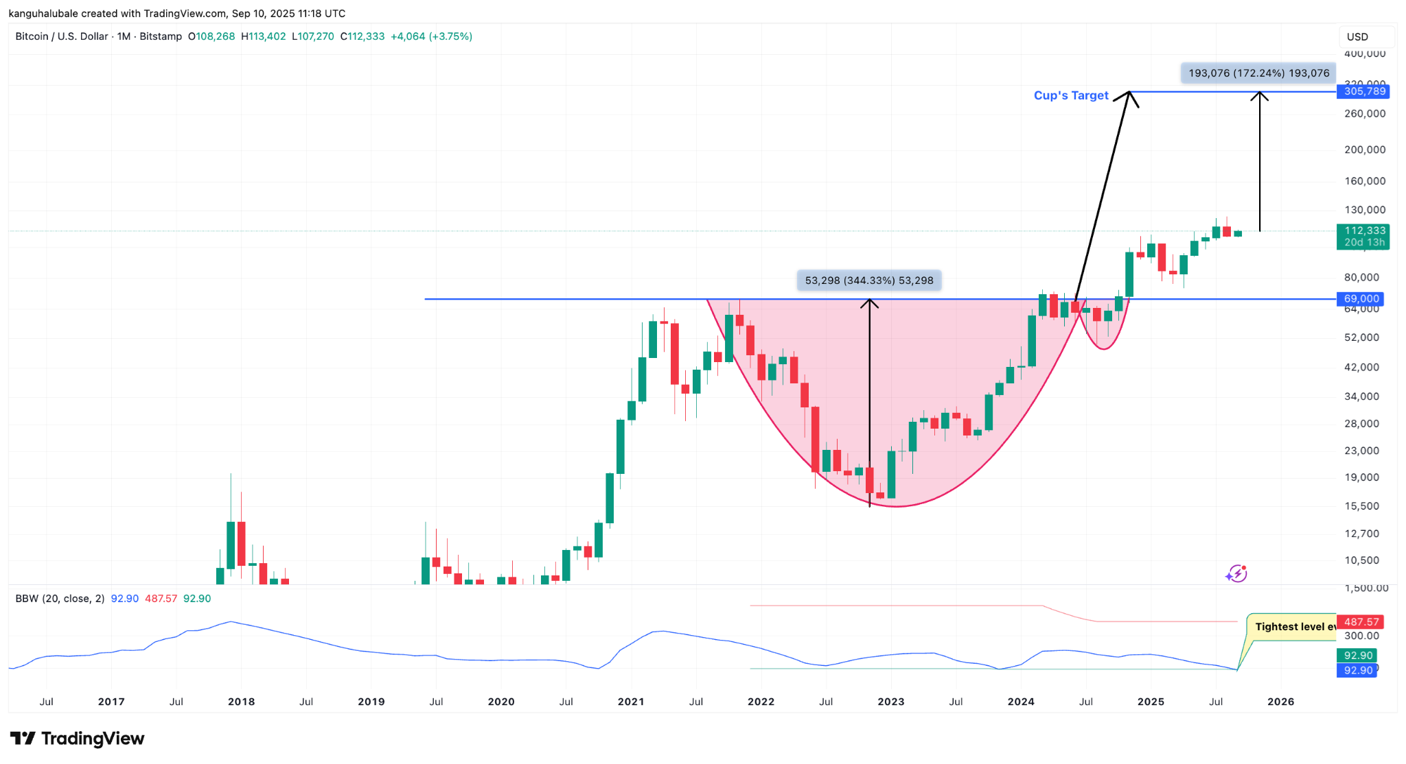 ์ด๋กœ์จ 2025-2026๋…„ ๋น„ํŠธ์ฝ”์ธ์˜ ์ปต ์•ค ํ•ธ๋“ค ๋ŒํŒŒ ๋ชฉํ‘œ๋Š” ํ˜„์žฌ ๊ฐ€๊ฒฉ ์ˆ˜์ค€๋ณด๋‹ค 170% ์ด์ƒ ์ƒ์Šนํ•œ ์•ฝ 305,000๋‹ฌ๋Ÿฌ๊ฐ€ ๋  ๊ฒƒ์ž…๋‹ˆ๋‹ค.