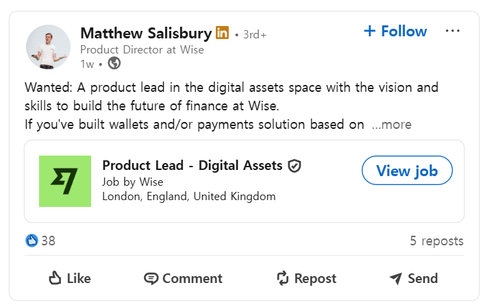 ์์ด์ฆ, โ๋์งํธ ์์ฐ ์ฑ ์์โ ์ฑ์ฉ๋งํฌ๋์ธ ๊ณต๊ณ ์ 100๋ช ์ด์ ๋ชฐ๋ ค์ค๋จ๋ฏธยท์ํ๋ฆฌ์นด ์ก๊ธยท๊ฒฐ์ ์์ ๋์๋น์(Visa)๋ B2B ํ์ผ๋ฟ ์ฐฉ์ ๊ฐ์ถ์ ์ฌ์ง ํ๋ ๋งคํ ์์ฆ๋ฒ ๋ฆฌ(Matthew Salisbury) ์์ด์ฆ ์ ํ ๋๋ ํฐ๊ฐ ๋งํฌ๋์ธ์ ๊ฒ์ํ ‘๋์งํธ ์์ฐ ์ ํ ์ฑ ์์(Product Lead – Digital Assets)’ ์ฑ์ฉ ๊ณต๊ณ . [์๋ฃ=๋งํฌ๋์ธ ์บก์ฒ] ๊ธ๋ก๋ฒ ์ ๋น์ฉ ์ก๊ธ ์์ฅ์ ๊ฐ์ ์์ด์ฆ(Wise)๊ฐ ์คํ ์ด๋ธ์ฝ์ธ์ ์ค์ ์ ๋ ๋์งํธ ์์ฐ ์ ํ ์ฑ ์์(Head of Digital Assets Product) ์ฑ์ฉ์ ๋์๋ฉฐ ๊ฐ์์์ฐ ์์ฅ์ ๋ณธ๊ฒฉ ๋ฐ์ด๋ ๋ค. ์ด๋ ๋ณํํ๋ ๊ธ๋ก๋ฒ ๊ท์ ํ๊ฒฝ ์์์ ์ฐจ์ธ๋ ๊ฒฐ์ ์์คํ ์ ์ ์ ํ๋ ค๋ ์ ๋ต์ ํฌ์์ผ๋ก ํ์ด๋๋ค. ๋งคํ ์์ฆ๋ฒ ๋ฆฌ ์์ด์ฆ ์ ํ ๋๋ ํฐ๋ ์ง๋์ฃผ ๋งํฌ๋์ธ(LinkedIn)์ ํตํด ๋ฐ๋ ๋ณธ์ฌ์์ ๊ทผ๋ฌดํ ํด๋น ์ง๋ฌด ์ฑ์ฉ ๊ณต๊ณ ๋ฅผ ๊ฒ์ํ ๊ฒ์ผ๋ก 21์ผ ํ์ธ๋๋ค. ๊ทธ๋ โ์คํ ์ด๋ธ์ฝ์ธ์ ๊ธฐ๋ฐ์ผ๋ก ์ง๊ฐ์ด๋ ๊ฒฐ์ ์๋ฃจ์ ์ ๊ฐ๋ฐํ ๊ฒฝํ์ด ์๊ณ , ์์ด์ฆ์์ ๊ทธ๊ฒ์ ํด๋ณด๊ณ ์ถ๋ค๋ฉด ์ง์ํด๋ฌ๋ผโ๊ณ ์ง์ ๋ฐํ๋ค. ํด๋น ๊ณต๊ณ ๋ ๊ฒ์ ์งํ 100๋ช ์ด์์ ์ง์์๊ฐ ๋ชฐ๋ฆฌ๋ฉฐ ์ ๊ณ์ ๋์ ๊ด์ฌ์ ์ ์ฆํ๋ค. ์ต์ข ํฉ๊ฒฉ์๋ ์์ด์ฆ์ ‘๊ณ์ (Accounts)’ ํ์ ํฉ๋ฅํด ๊ณ ๊ฐ์ด ์์ด์ฆ ๊ณ์ ๋ด์์ ๋์งํธ ์์ฐ์ ๋ณด์ ํ ์ ์๋ ๋ฐฉ์์ ๋ชจ์ํ๋ ์ค์ฑ ์ ๋งก๋๋ค. ์์ด์ฆ๋ ์ง์ ์๊ฒฉ์ผ๋ก โ์ต์ 5๋ ์ด์์ ์ ํ ๊ด๋ฆฌ ๊ฒฝ๋ ฅ๊ณผ ๋์งํธ