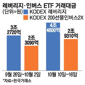 ์ถ์์ดํ ๋ ๋ฒ๋ฆฌ์ง์ 600์ต๊ณฑ๋ฒ์ค๋ 970์ต ๋๊ฑฐ ์ฌ๋ค์ฌ ์ฌ์ง ํ๋ ์ถ์ ์ฐํด ์ดํ ๊ฐ์ธ๋ค์ ๋ ๋ฒ๋ฆฌ์งยท๊ณฑ๋ฒ์ค ๊ฑฐ๋๊ฐ ๊ธ์ฆํ๊ณ ์๋ค. ์ฃผ๊ฐ๊ฐ ์ฐ์ผ ์ฌ์ ์ต๊ณ ์น๋ฅผ ๊ฒฝ์ ํ๋ ์ํฉ์์ ์์นยทํ๊ฐ์ ๋ํ ๊ณผ๊ฐํ ๋ฒ ํ ์ด ๋ชจ๋ ๋์ด๋ ๊ฒ์ด๋ค. ๊ฐ์ธํฌ์์๋ค์ ๋ ๋ฒ๋ฆฌ์ง ์๋งค๋์์ ์๋งค์๋ก ์ ํํ๊ณ , ๊ณฑ๋ฒ์ค๋ ์๋งค์ ๊ท๋ชจ๋ฅผ ๋ ํค์ ๋ค. ๋ฐ๋ฉด ์ธ๊ตญ์ธ์ ๋ ๋ฒ๋ฆฌ์ง ์๋งค์์์ ์๋งค๋๋ก ๋์์ฐ๊ณ , ๊ณฑ๋ฒ์ค๋ ์๋งค์์์ ์๋งค๋ ์ ํํ๋ค. 16์ผ ํ๊ตญ๊ฑฐ๋์์ ๋ฐ๋ฅด๋ฉด KODEX ๋ ๋ฒ๋ฆฌ์ง(๋ ๋ฒ๋ฆฌ์ง ๊ฑฐ๋๋๊ธ 1์) ๊ฑฐ๋๋๊ธ์ 10์ 10~16์ผ 5๊ฑฐ๋์ผ๊ฐ 4์กฐ4600์ต์์ผ๋ก ์ถ์ ์ ์ธ 9์ 26์ผ~10์ 2์ผ(3์กฐ2720์ต์)๋ณด๋ค 36.3% ๊ธ์ฆํ๋ค. ๊ฐ์ธ์ 9์ 26์ผ~10์ 2์ผ KODEX ๋ ๋ฒ๋ฆฌ์ง๋ฅผ 1730์ต์ ์๋งค๋ํ์ผ๋ 10์ 10~16์ผ 600์ต์ ์๋งค์ํ๋ค. ์ฝ์คํผ๊ฐ ์์นํ ๊ฒ์ผ๋ก ๋ณด๊ณ ๋ฑ๋ฝ๋ฅ ์ 2๋ฐฐ ์ํ์ ๋ฒ ํ ํ ๊ฒ์ด๋ค. ํํธ KODEX 200์ ๋ฌผ์ธ๋ฒ์ค2X(๊ณฑ๋ฒ์ค ๊ฑฐ๋๋๊ธ 1์) ๊ฑฐ๋๋๊ธ์ 9์ 26์ผ~10์ 2์ผ 2์กฐ3090์ต์์์ 10์ 10~16์ผ 2์กฐ9310์ต์์ผ๋ก 26.93% ์ฆ๊ฐํ๋ค. ๊ฐ์ธ ๊ฑฐ๋๋๊ธ์ 1์กฐ2310์ต์์์ 1์กฐ4330์ต์์ผ๋ก 16.4%, ์ธ๊ตญ์ธ์ 6460์ต์์์ 9770์ต์์ผ๋ก 51.23% ๋์๋ค. ๊ฐ์ธ์ 9์ 26์ผ~10์ 2์ผ KODEX 200์ ๋ฌผ์ธ๋ฒ์ค2X๋ฅผ 870์ต์ ์๋งค์ํ๊ณ 10์ 10~16์ผ์๋ ์๋งค์ ๊ท๋ชจ๋ฅผ 970์ต์์ผ๋ก ํค์ ๋ค. ์ฝ์คํผ ํ๋ฝ์ ๋ฒ ํ ํ๋ ๊ฐ๋๋ฅผ ๋์ธ ๊ฒ์ด๋ค. ๋ฐ๋ฉด ์ธ๊ตญ์ธ์ 30์ต์ ์๋งค์์์ 230์ต์ ์๋งค๋๋ก ๋์์ฐ๋ค. [๊นํ์ฃผ ๊ธฐ์] ์ด ๊ธฐ์ฌ๊ฐ ๋ง์์ ๋ค์๋ค๋ฉด, ์ข์์๋ฅผ ๋๋ฌ์ฃผ์ธ์. ์ข์์