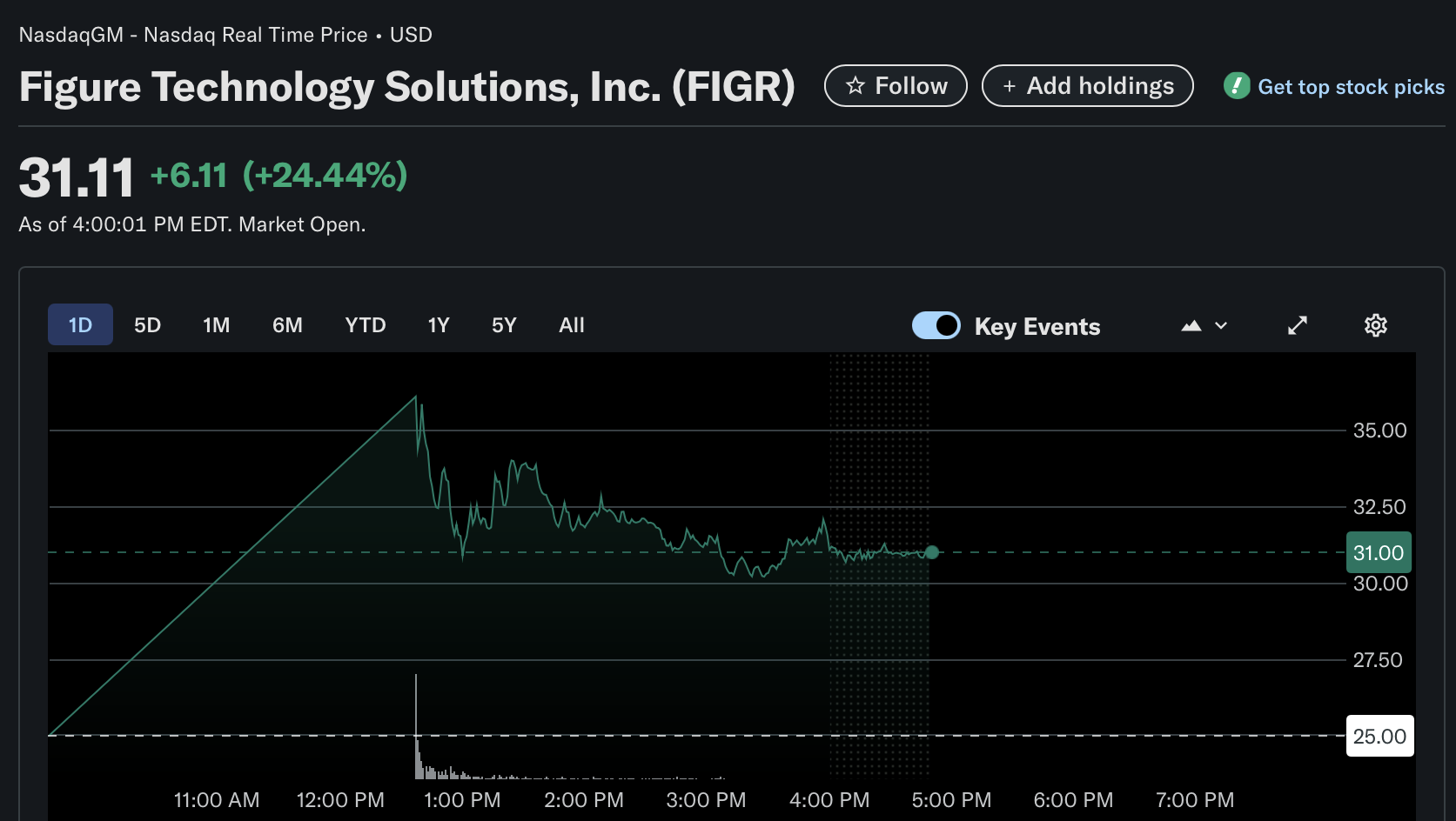 ๋˜ ๋‹ค๋ฅธ ๊ณต๊ฐœ ์ƒ์žฅ์—์„œ Figure Technologies์˜ ์ฃผ์‹์€ ๋ชฉ์š”์ผ ๋‚˜์Šค๋‹ฅ์— ๋ฐ๋ท”ํ–ˆ์œผ๋ฉฐ ์ฒซ ๊ฑฐ๋ž˜์ผ์— ์ฃผ๊ฐ€๊ฐ€ 24.4% ๊ธ‰๋“ฑํ–ˆ์Šต๋‹ˆ๋‹ค.